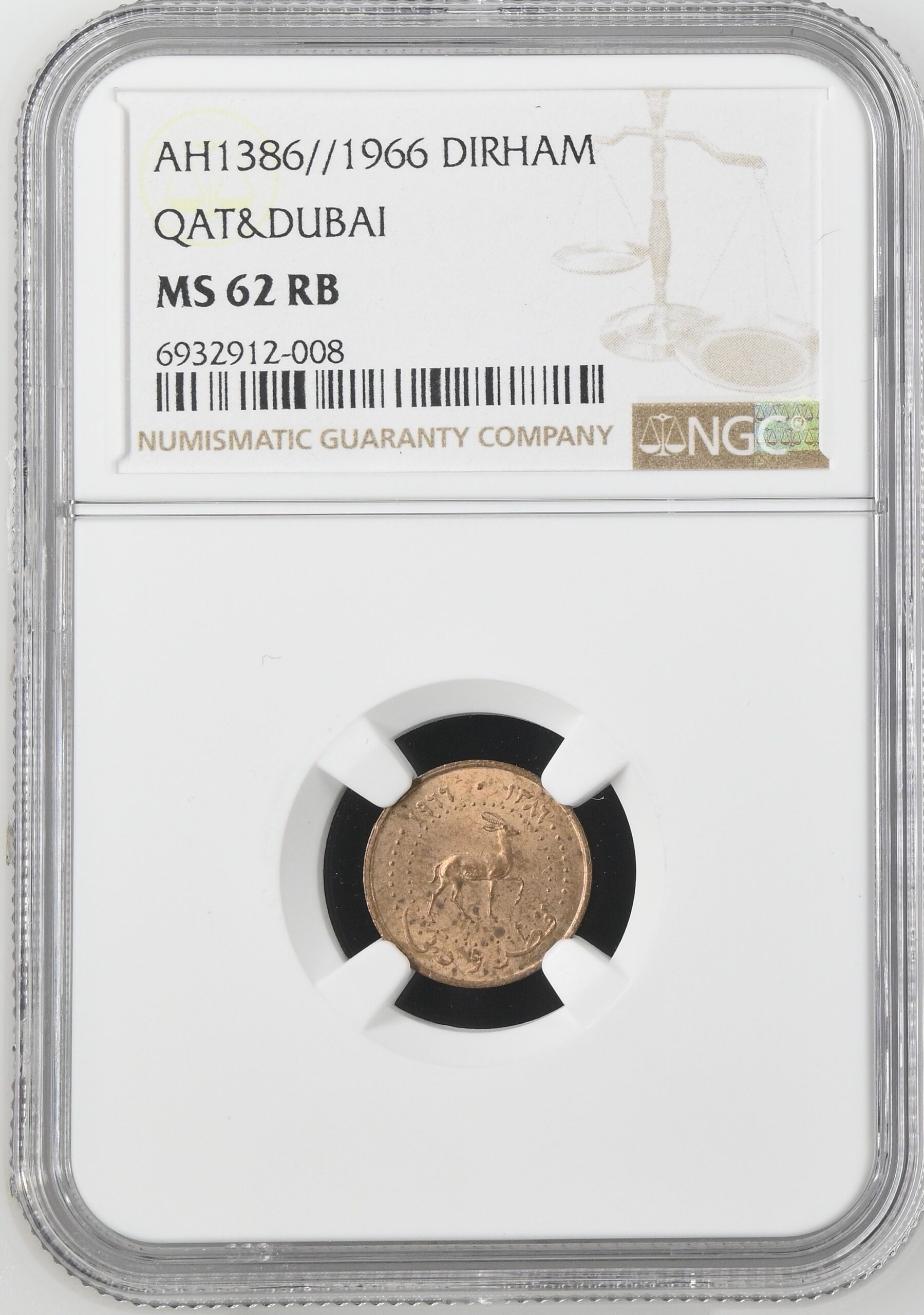 Qatar and Dubai 1 Dirham AH1386 (1966) KM-1 NGC MS 62 RB Choice Uncirculated