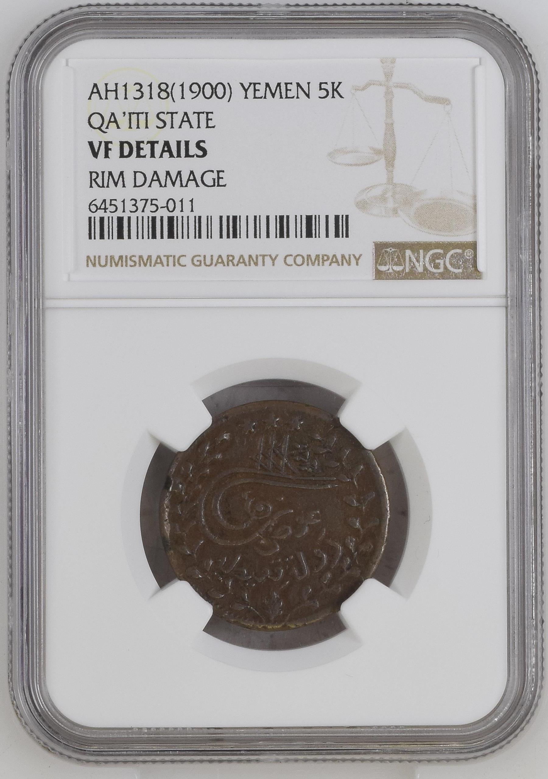 Yemen Qa’iti State 5 Khumsi AH1318 (1900) KM-45 NGC VF Details Copper